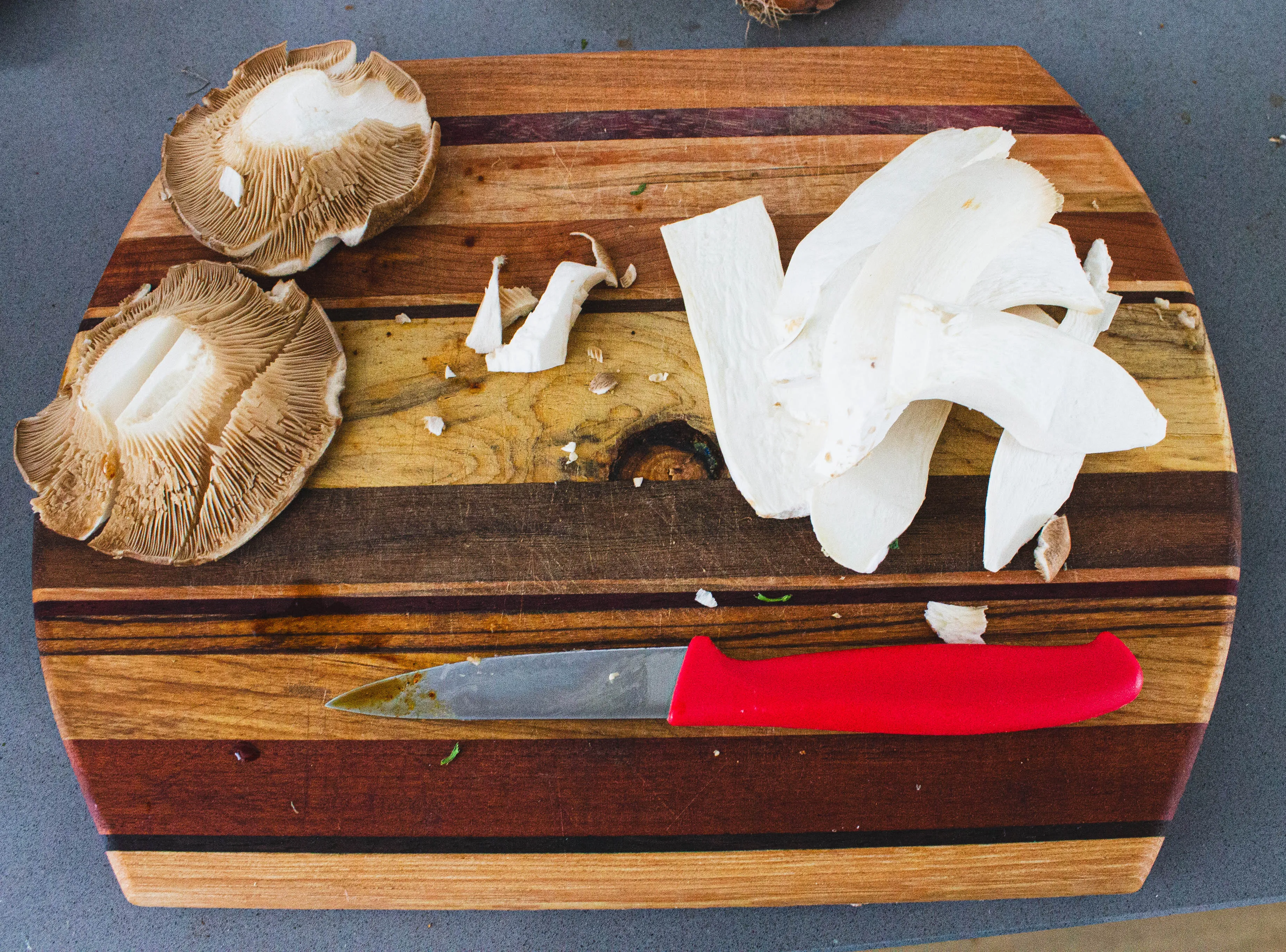 It’s time to make a lovely marinade. Combine all your marinade ingredients in a bowl (or takeaway container), mixing until everything is nice and blended. Slice your oyster mushrooms into strips. I recommend doing this by beheading them (calling them foul bourgeoise pig dogs before you do so is optional, but encouraged), slicing the stems into strips, then quartering their heads. Toss the mushrooms into the marinade, and give everything a lovely mix to make sure it all gets covered. Leave the mushrooms there to think about what they’ve done while you move on to grinning gleefully over fruit, wielding your knife high.