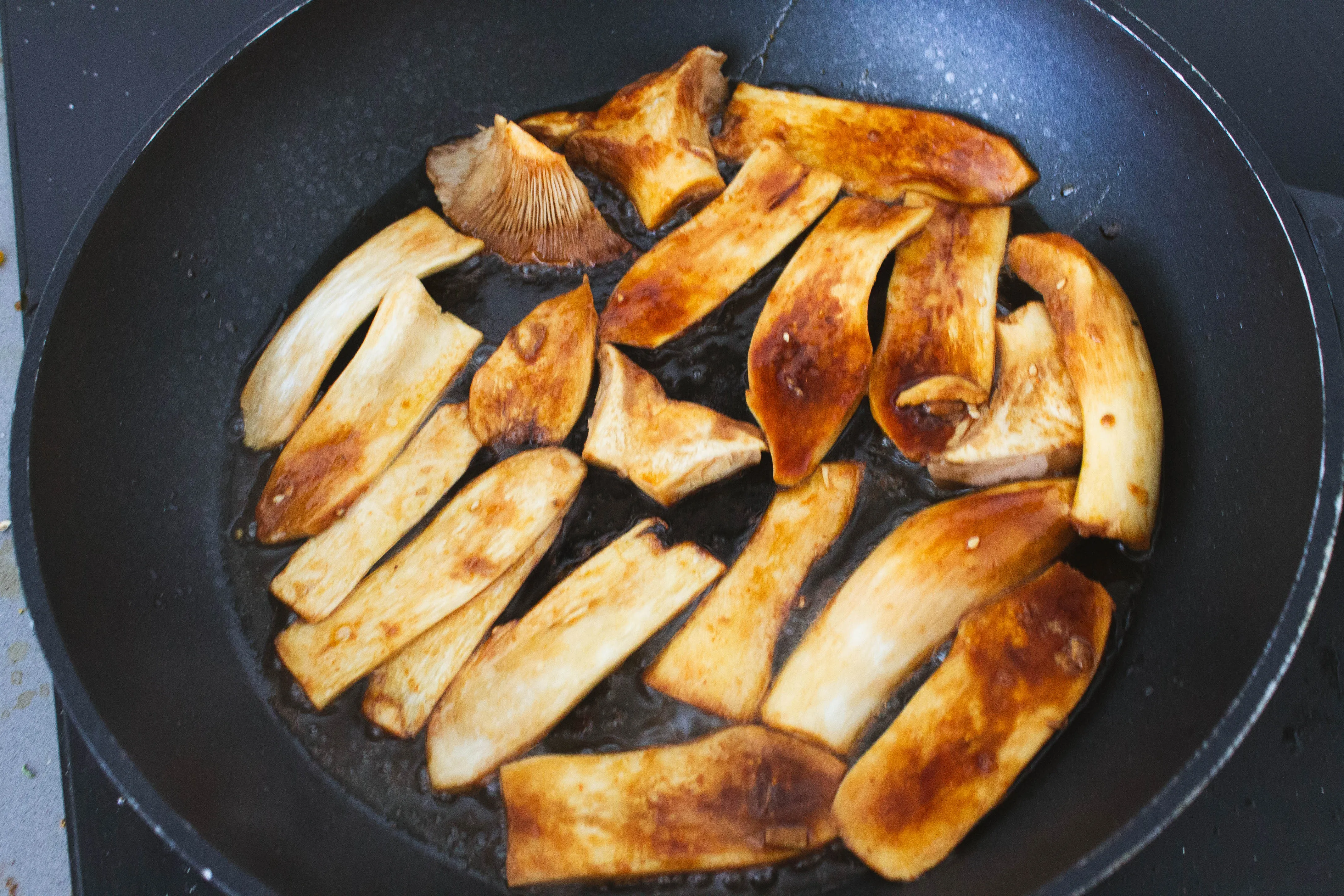 For the mushrooms: I suggest king oyster mushrooms here because they slice nicely into strips and do a good job absorbing marinades. In general, though, any neutral flavoured mushroom should be fine here. Portobellos may even do nicely, but I didn’t try them.