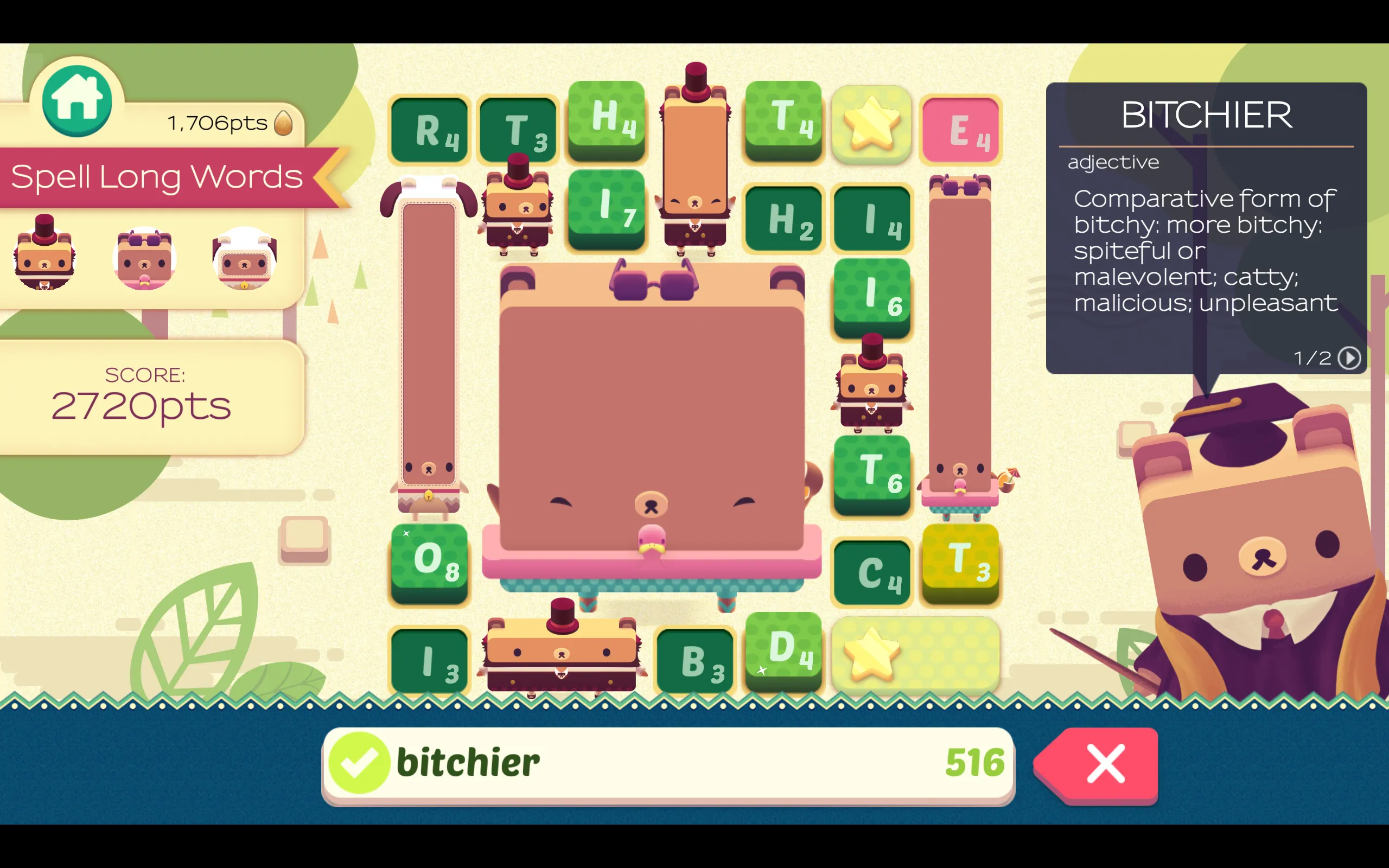 There is a lot about these mechanics that works. The idea of finding words in a jumble of letters is a tried and true formula, but is also one that has been played out in a large variety of forms already. Making each letter single use and adding a timer adds a more strategic dimension to the puzzle that is a welcome change of pace. Rather than having a grand old time making monstrously long words, I thought more strategically about what I wanted to make, and why I did have to use that x with one turn left on it, actually. The inclusion of these mechanics forces the player to stretch beyond the familiar words they’re used to in these types of games, and instead, reach for more esoteric and exotic ways to make their bears grow and grow.